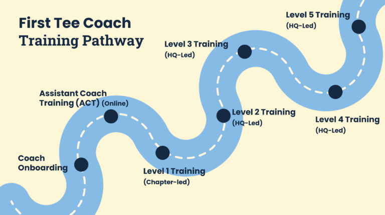 All level Assistant and Lead Coaches are trained to deliver First Tee golf and life skills curriculum. This training system is built on research-proven methods of positive youth development, providing coaches with the tools to make kids feel safe, included and empowered. Admin support staff also receive training, but only through a one-time session. Click below to view the Coaches pathway – Level 1 and above are designed for Lead Coaches.